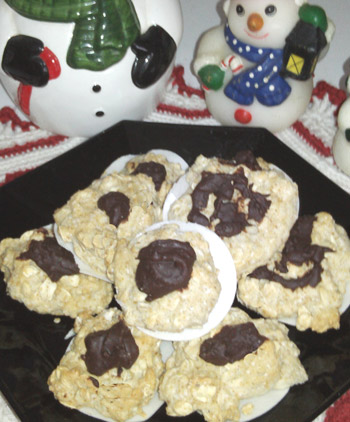 vorgeheizten Backofen bei ( E-Herd: 150 °C/ ca. 15 Min. backen. Die abgekülten Haferflockenmakronen mit Schokolasur besteichen.