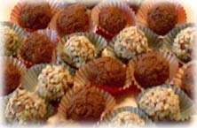 Schüssel fein zerbröseln. Gelee und Rum nun in die Masse kneten bis eine formbare Kuchenmasse entsteht. Jetzt aus dieser Masse 30 Kugeln formen. Zur Dekoration einige Kugel in Raspel-Schokolade wälzen, einige